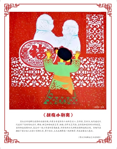 温丽桃 / 剪纸 《战疫小别离》 在抗击新冠肺炎疫情的关键时期,内蒙古非遗传承人始终在关心、在牵挂、在助力,他们通过代 代流传下来的传统音乐、舞蹈、曲艺和传统技艺等,酝酿、创作文艺作品,宣传党和国家的方针政策, 宣传防控疫情知识,表达对一线工作者的崇高敬意,用特殊的方式助阵疫情防控阻击战。本幅作品 描绘了蒙古族儿女舍小家顾大家,勇于担当、义无反顾奔赴一线的场景,作品温馨让人感动。 (鄂尔多斯群众艺术馆供图)