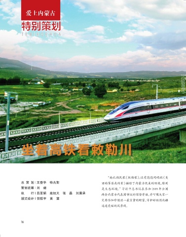 爱上内蒙古 SJDDJYB 特别策划 特别策划 TE BIE CEHUA 坐着高铁看敕勒川 “南北朝民歌《敕勒歌》、还有德德玛唱的《美 总 策 划 | 王登华 特古斯 丽的草原我的家》描绘了内蒙古优美的环境,特别 策划统筹 | 刘 婧 是生态环境。”习近平总书记在参加 2019 年全国 执 行 | 吕亚娟 高旭天 张 晶 刘秉承 两会内蒙古代表团审议时深情寄语,并叮嘱大家一 版式设计 | 贺振宇 黄 震 定要倍加珍惜这一最宝贵的财富,守护好祖国北疆 这道亮丽的风景线。 16