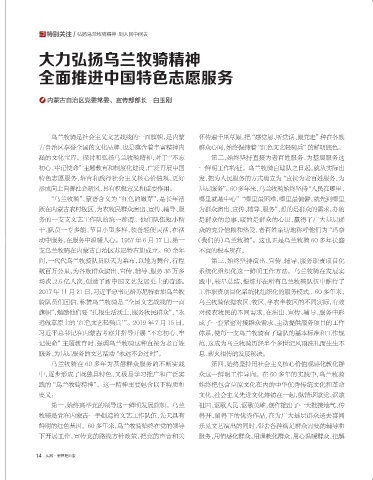 跃在内蒙古农村牧区,为农牧民群众演出、宣传、辅导、服 为群众演出、宣传、辅导、服务”,想的是群众的需求,办的 和家庭的苦乐酸甜。但是,只要以“乌兰牧骑”出现在群 工作的关键。我们要在全面推进中国特色志愿服务工