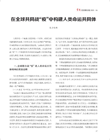 所未有的风险和挑战中。此次全球大规模暴发的新冠 (二)携手合作、共克时艰是守护人类命运共同体
