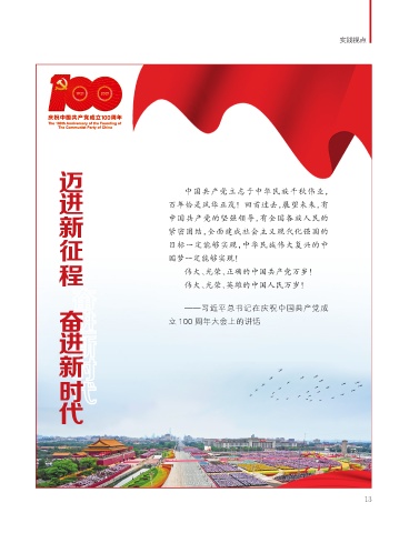 实践视点 迈进新征程 中国共产党立志于中华民族千秋伟业, 百年恰是风华正茂!回首过去,展望未来,有 中国共产党的坚强领导,有全国各族人民的 紧密团结,全面建成社会主义现代化强国的 目标一定能够实现,中华民族伟大复兴的中 国梦一定能够实现! 奋进新时代 伟大、光荣、正确的中国共产党万岁! 伟大、光荣、英雄的中国人民万岁! ——习近平总书记在庆祝中国共产党成 立 100 周年大会上的讲话 13