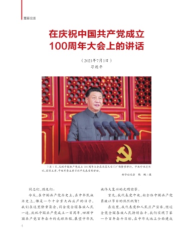 7 月 1 日,庆祝中国共产党成立 100 周年大会在北京天安门广场隆重举行。中共中央总书