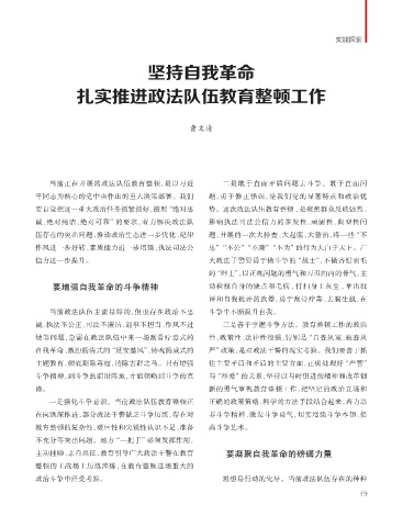 一是强化斗争意识。当前政法队伍教育整顿正 正确的政策策略、科学的方法手段结合起来,着力培