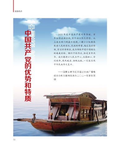 实践视点 中国共产党的优势和特质 2021 年是中国共产党百年华诞。百 年征程波澜壮阔,百年初心历久弥坚。从 上海石库门到嘉兴南湖,一艘小小红船承 载着人民的重托、民族的希望,越过急流险 滩,穿过惊涛骇浪,成为领航中国行稳致远 的巍巍巨轮。胸怀千秋伟业,恰是百年风 华。我们秉持以人民为中心,永葆初心、牢 记使命,乘风破浪、扬帆远航,一定能实现 中华民族伟大复兴。 ——国家主席习近平通过中央广播电 视总台和互联网发表的二〇二一年新年贺 词 12