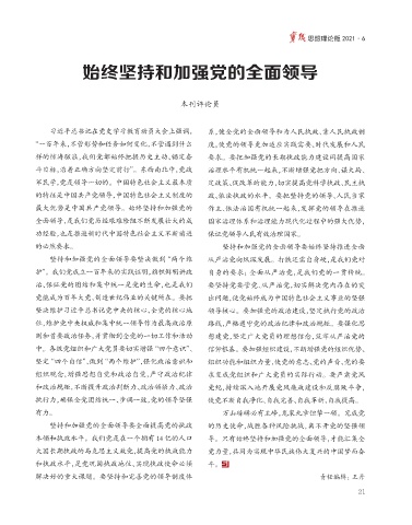 本领和执政水平。我们党是在一个拥有 14 亿的人口 导。只有始终坚持和加强党的全面领导,才能汇集全
