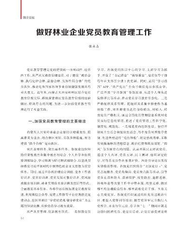 教育管理实际,积极探索林区党员教育管理的经验 集体评比等活动,推动党员学习教育常态化。二是