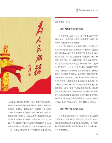 法,用于武装头脑、指导实践、推动工作。要见行动,外 心中最高位置,坚持全心全意为人民服务的根本宗旨, 是为国家发展和人民幸福添了一块砖、补了一片瓦。因 干部要敢想、敢做、敢当。做我们时代的劲草、真金。”