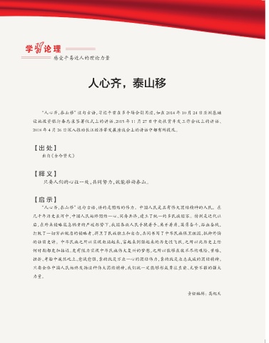 现,能否敢担当就是看肩膀,看能不能负重。不能只想 来为百姓谋利而不是用来满足自己的私欲。要做到“勿 “人心齐,泰山移”这句古语,习近平曾在多个场合引用过,如在 2014 年 10 月 24 日亚洲基础