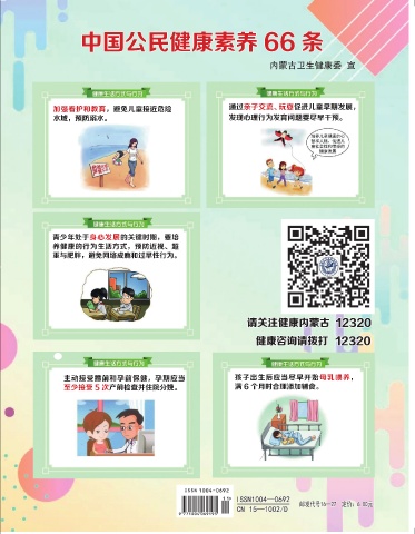 中国公民健康素养 66 条 内蒙古卫生健康委 宣 加强看护和教育,避免儿童接近危险 通过亲子交流、玩耍促进儿童早期发展, 水域,预防溺水。 发现心理行为发育问题要尽早干预。 青少年处于身心发展的关键时期,要培 养健康的行为生活方式,预防近视、超 重与肥胖,避免网络成瘾和过早性行为。 请关注健康内蒙古 12320 健康咨询请拨打 12320 主动接受婚前和孕前保健,孕期应当 孩子出生后应当尽早开始母乳喂养, 至少接受 5 次产前检查并住院分娩。 满 6 个月时合理添加辅食。