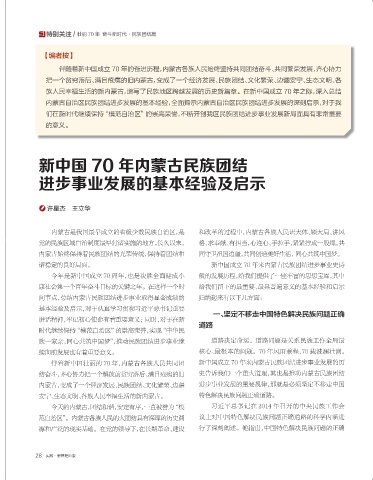 伴着新中国壮丽的 70 年,内蒙古各族人民共同团                        新中国成立 70 年来内蒙古民族团结进步事业发展的历                                       在、幸福所在。要全面加强党的建设,在总体布局中突出                          是解决民族地区各种问题的总钥匙。要发展就要坚持生