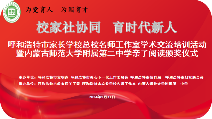此次活动由呼和浩特市文明办、呼和浩特市关心下一代工作委员会、呼和浩特市教育局、呼和浩特市妇女联合会主办,呼和浩特市教育局关工委、呼和浩特市家长学校名师工作室和内蒙古师范大学附属第二中学共同承办。
