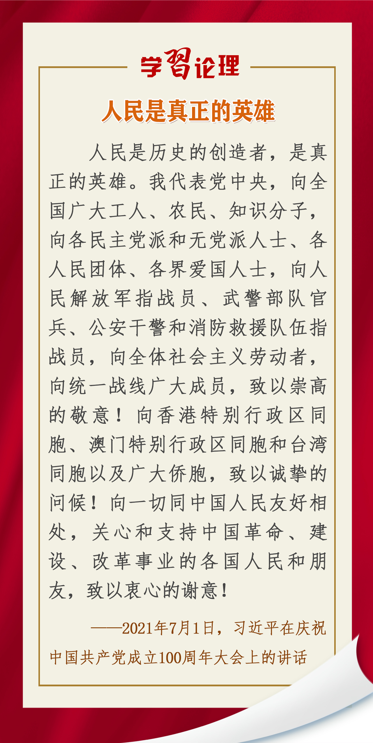 伟大出自平凡,英雄来自人民。波澜壮阔的中国共产党百年发展史是中国人民书写的,中华民族迎来了从站起来、富起来到强起来的伟大飞跃是中国人民奋斗出来的,在党和国家行进的每个重大历史瞬间,处处都有人民的身影。正如习近平总书记说的,“人民是历史的创造者,是真正的英雄。”