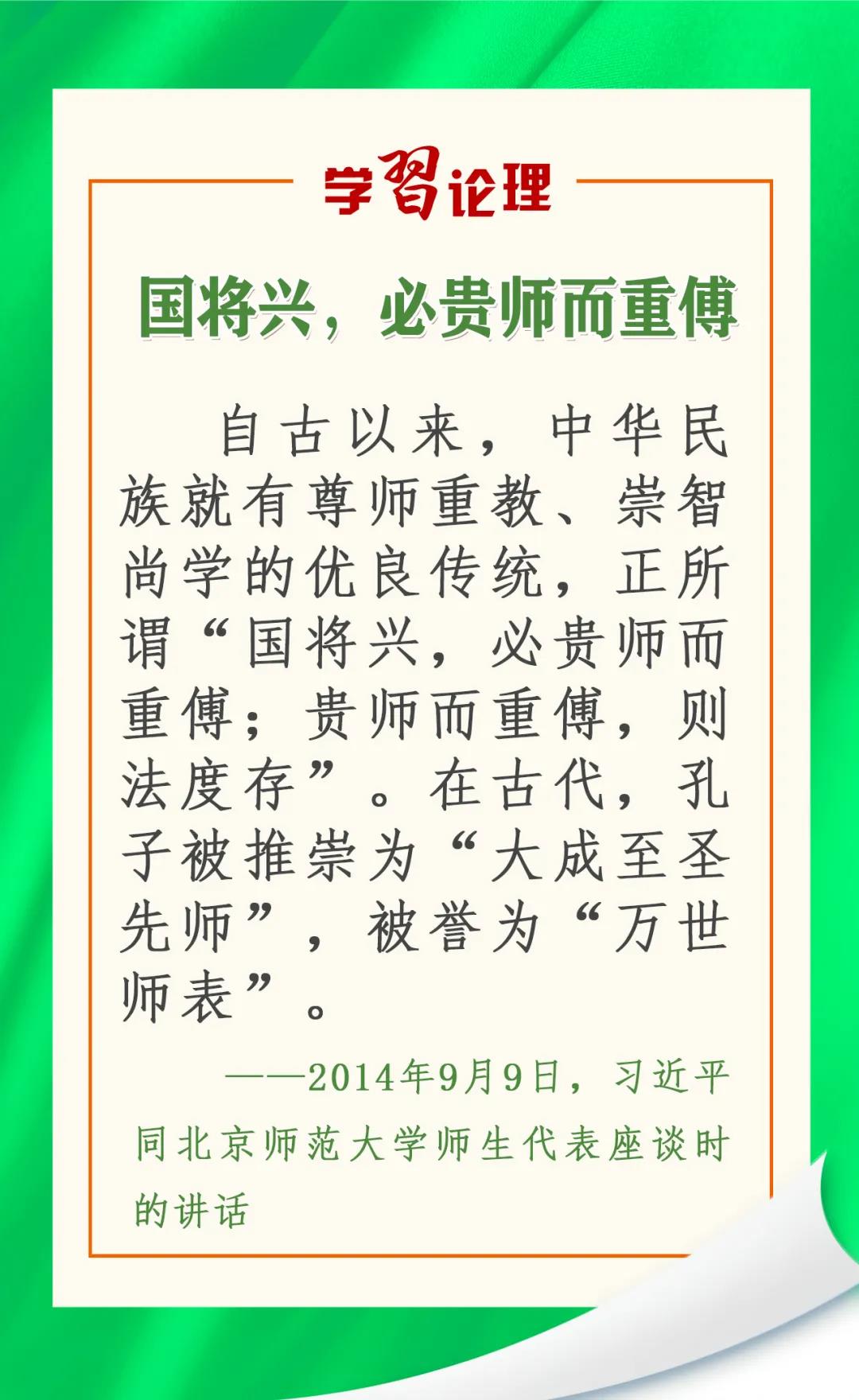 百年大计,教育为本;教育大计,教师为本。从用毕生精力践行“振兴中华,乃我辈之责”铿锵誓言的黄大年,到让“学生们远方有灯、脚下有路、眼前有光”的张桂梅;从35年如一日扎根太行山、将论文写在祖国大地上的李保国,到不仅一辈子做教师、还坚持“一辈子学做教师”的于漪……他们用坚守与奉献,展现了当代人民教师的高尚师德与责任担当。正是有了黄大年、张桂梅等一批批优秀人民教师的坚守与奉献,使教师这个职业焕发出时代光彩,也使得越来越多的年轻人义无反顾地选择了教师这个职业。教师是立教之本、兴教之源,理应获得社会的尊重和礼赞。只有教师得到应有的尊敬,教师所传授的道理和知识才能得到尊重,才能形成热爱学习、尊重知识、崇尚科学的良好风气;只有全社会都行动起来,用心用情用力关爱教师,才能让教师真正成为最受社会尊重和令人羡慕的职业,才能营造尊师重傅的良好风尚。