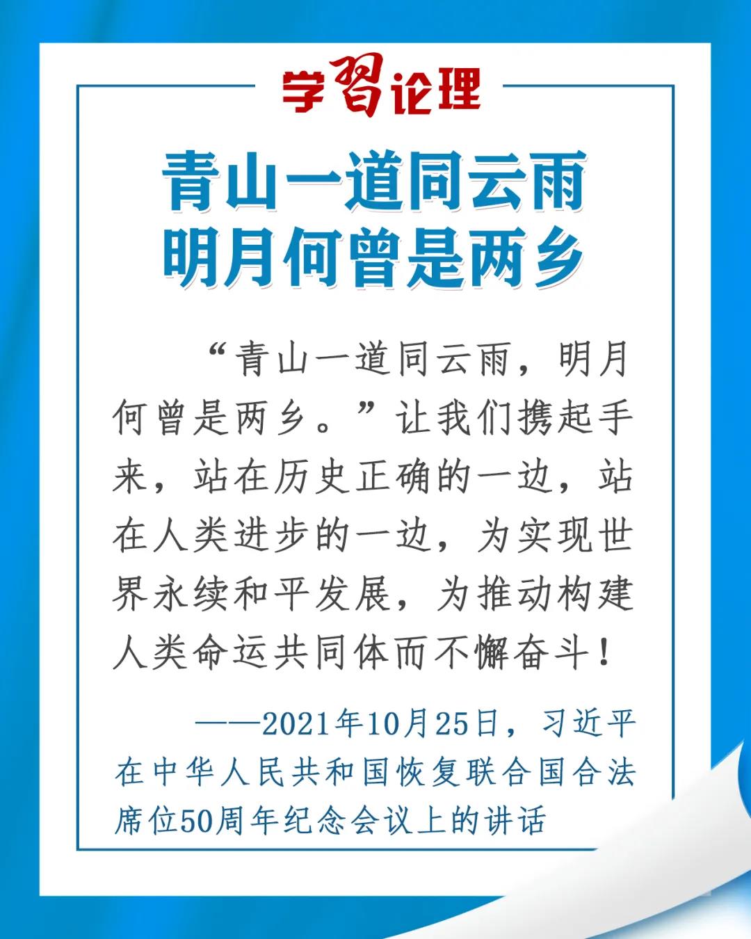 通往美好世界的道路,需要携手同行。中华人民共和国恢复在联合国合法席位50年,是中国和平发展、造福人类的50年。从经济总量跃居世界第二,到实现全面建成小康社会的目标,再到开启全面建设社会主义现代化国家新征程;从始终奉行独立自主的和平外交政策,坚决反对霸权主义和强权政治,到援建坦赞铁路,推动共建“一带一路”,再到向各国输送大批抗疫物资、疫苗药品,深入开展病毒溯源科学合作;从派出5万多人次参加联合国维和行动,到率先实现联合国千年发展目标,再到带头落实2030年可持续发展议程……这50年,中国人民始终发扬自强不息精神,在风云变幻中把握中国前进方向,书写了中国以及人类发展的壮阔史诗;始终同世界各国人民团结合作,维护国际公平正义,为世界和平与发展作出了重大贡献;始终维护联合国权威和地位,践行多边主义,中国同联合国合作日益深化。50年,记录了一个东方古老民族上下求索、涅槃新生,进而以愈加伟岸的身姿走向世界的坚实步伐;镌刻下中华人民共和国在世界坐标系中发生深刻变迁和迈向世界舞台中央的铿锵足迹。