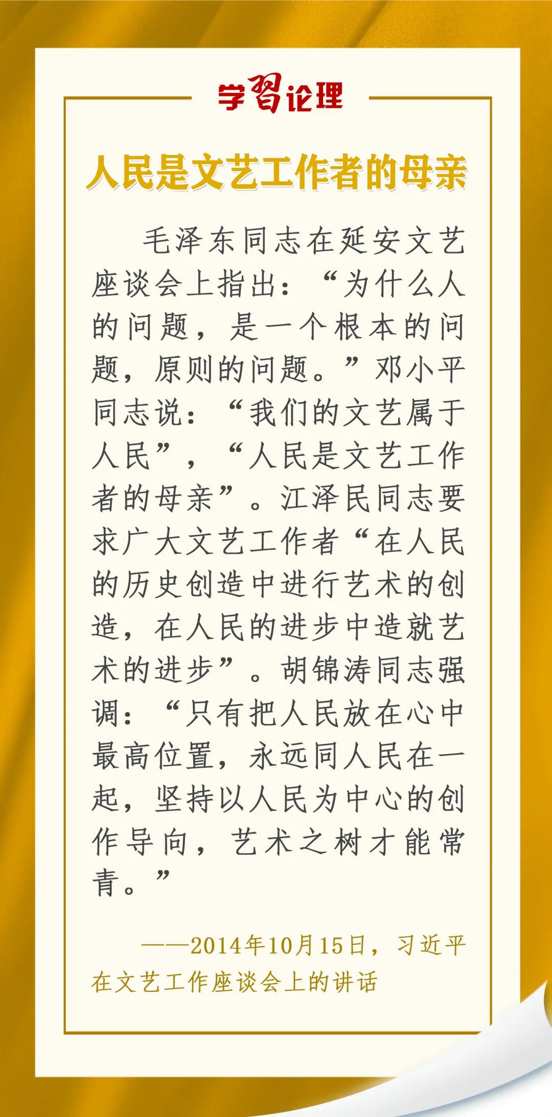 文艺创作的源泉在人民的实践中——人民是文艺创作的源头活水。一旦离开人民,文艺就会变成“无根的浮萍、无病的呻吟、无魂的躯壳”。70多年前,延安文艺座谈会后,大批文艺工作者走进乡村、扎根基层,真正与“手是黑的,脚上有牛屎”的工农兵大众打成一片,创作出《小二黑结婚》《白毛女》《兄妹开荒》等一大批植根人民的经典作品。优秀表演艺术家李雪健深入生活、扎根人民的40多年里所塑造的李大钊、焦裕禄、杨善洲等优秀共产党员形象,鲜活而丰满,让先烈英模永驻人民心间……文艺作品的生命力在人民的口碑里——人民是文艺的“剧作者”,更是文艺的“剧中人”。文艺作品能否“立得住、传得开、叫得响”,人民是考官;文艺作品合不合口味,人民最有发言权。人民是文艺创作的表现主体,是真实的、现实的、朴实的,不能用虚构的形象虚构人民,不能用调侃的态度调侃人民,更不能用丑化的笔触丑化人民。文艺工作者的价值体现在为人民服务上——文艺为了人民、服务人民,是我们党文艺工作的根本方向。60多年来,一代代乌兰牧骑队员以天为幕布,以地为舞台,传递党的声音和关怀,为农牧民放歌,为他们送去欢乐,成为全国文艺战线的一面旗帜。被誉为“谱写改革开放赞歌的音乐家”施光南,为人民歌唱,为时代抒怀,留下了《在希望的田野上》《吐鲁番的葡萄熟了》等洋溢着赤子之情的美妙旋律,激励着一代代青年奋发进取……
