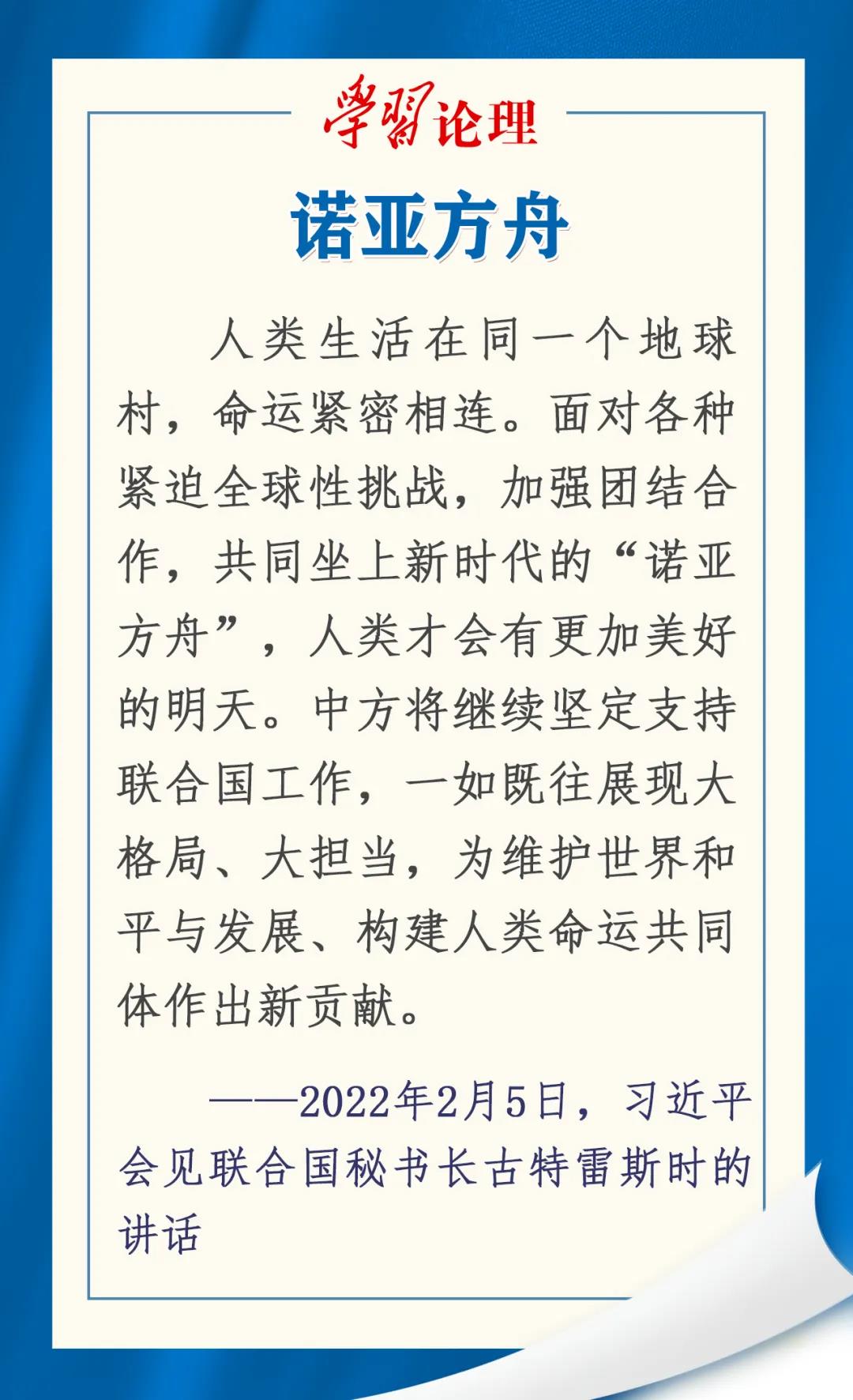 在西方神话中,诺亚建造了一艘方舟,带着各种牲畜、鸟类等躲避了大洪水,安然逃过“世界末日”;在构建人类命运共同体实践中,各国人民都坐在“地球号”这一艘“诺亚方舟”上,彼此风雨同舟、休戚与共,一荣共荣、一损俱损。近期,在会见国际奥委会主席巴赫和联合国秘书长古特雷斯时,习近平总书记两次以“舟”作喻,微言大义,传递中国推动构建人类命运共同体的决心。