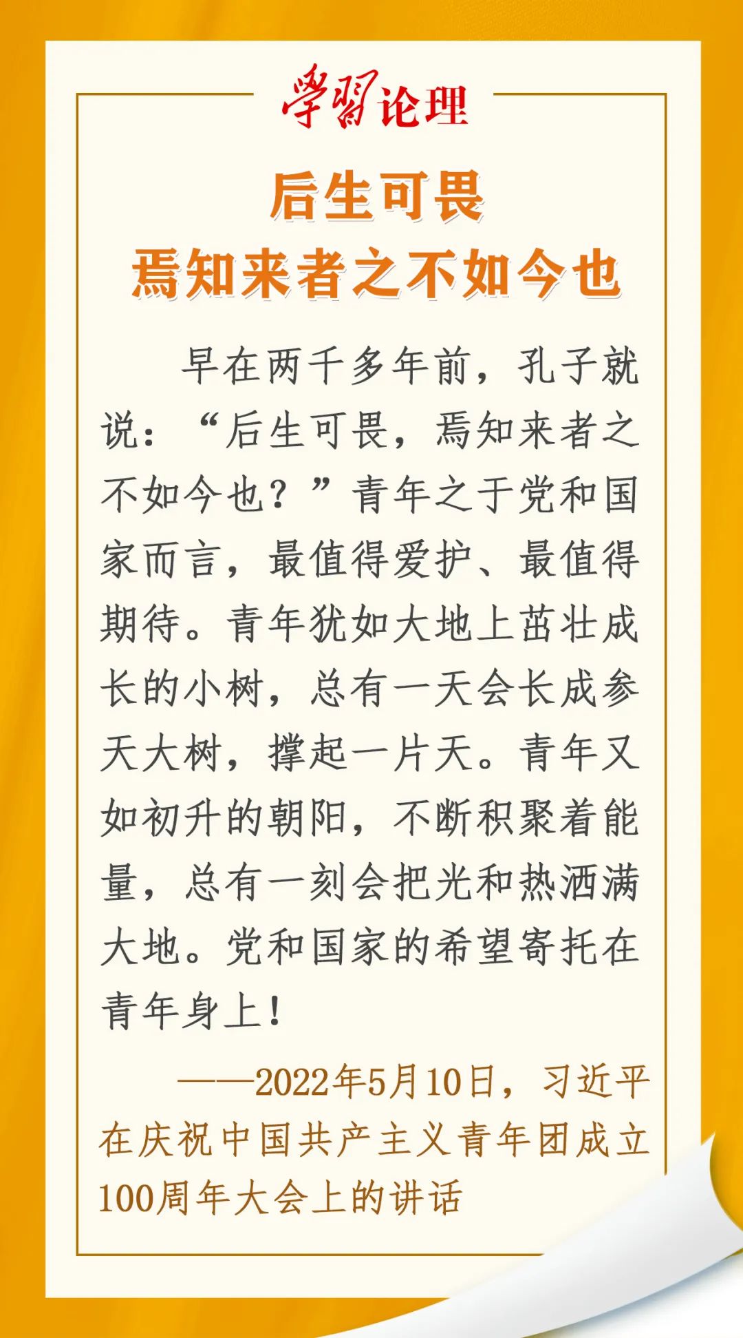 “青年犹如大地上茁壮成长的小树,总有一天会长成参天大树,撑起一片天。青年又如初升的朝阳,不断积聚着能量,总有一刻会把光和热洒满大地。”在庆祝中国共产主义青年团成立100周年大会上,习近平总书记将青年比喻为树和朝阳,字里行间洋溢着新时代领航人对新时代中国青年的关怀与寄望。