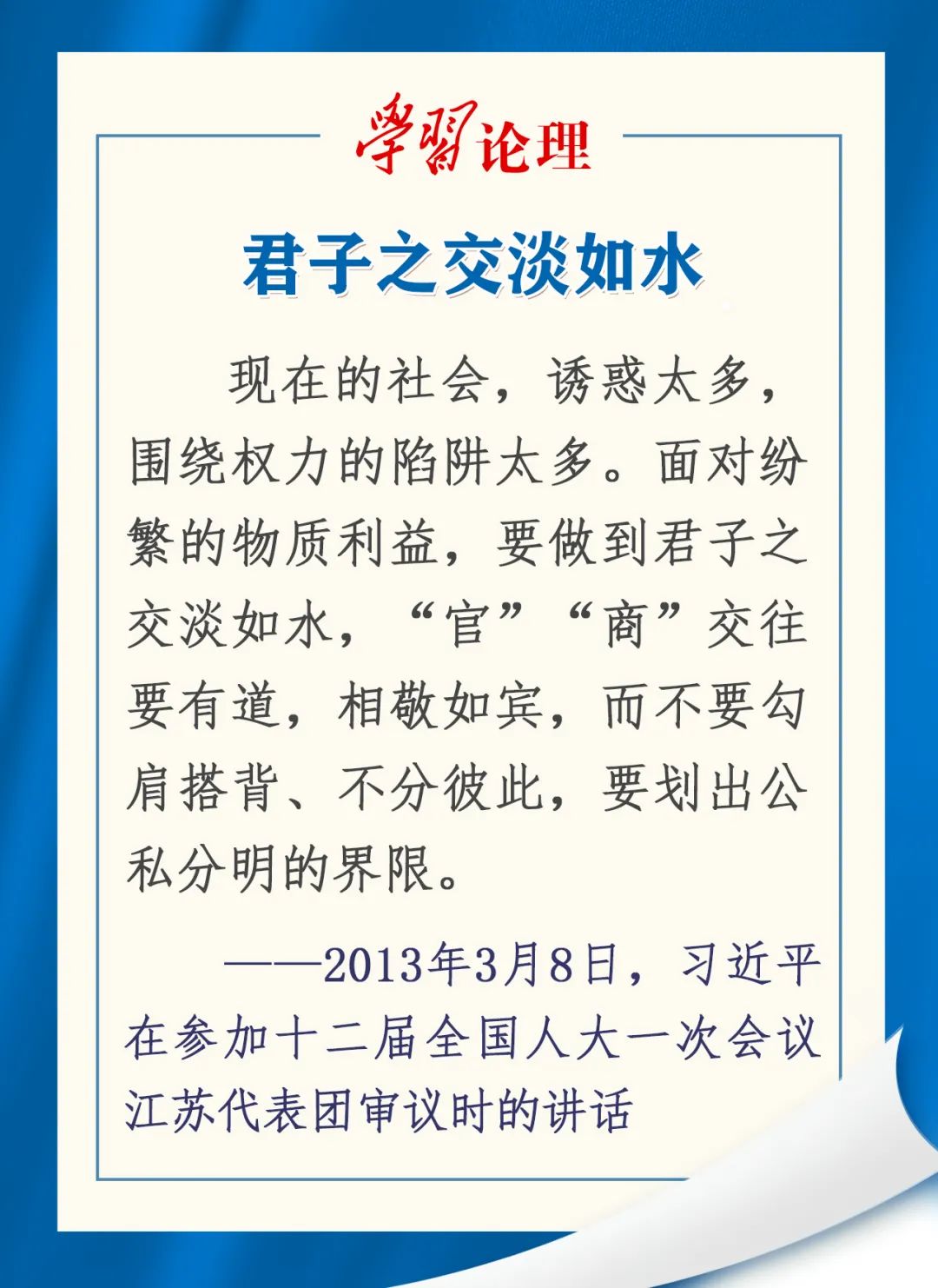 “君子之交淡如水,同志之交若清泉。”共产党人也有七情六欲,同志之间也有礼尚往来,但这种往来应该是道义之交、心灵之交,淡如水,清若泉,坦坦荡荡、清清爽爽;应该去私欲,存公心;去陋习,讲原则;去俗气,讲党性。希望每一名党员干部自觉加强对清的境界的追求、对清的本色的坚守、对清的风尚的呵护,让党内关系更简单、更纯洁、更坚强。