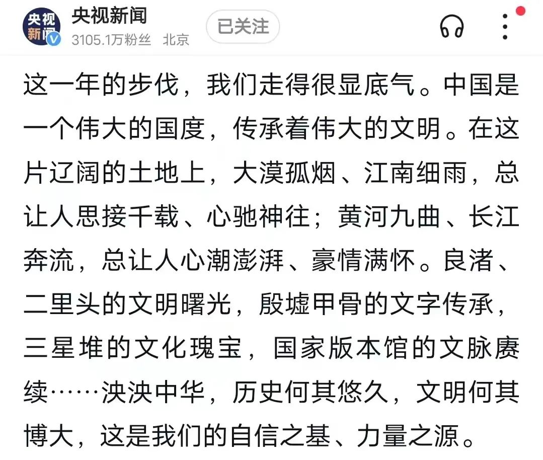 央视《焦点访谈》中说:“新年贺词中,习近平用美好的词汇和深情的话语,描述伟大祖国的文明与辽阔。”