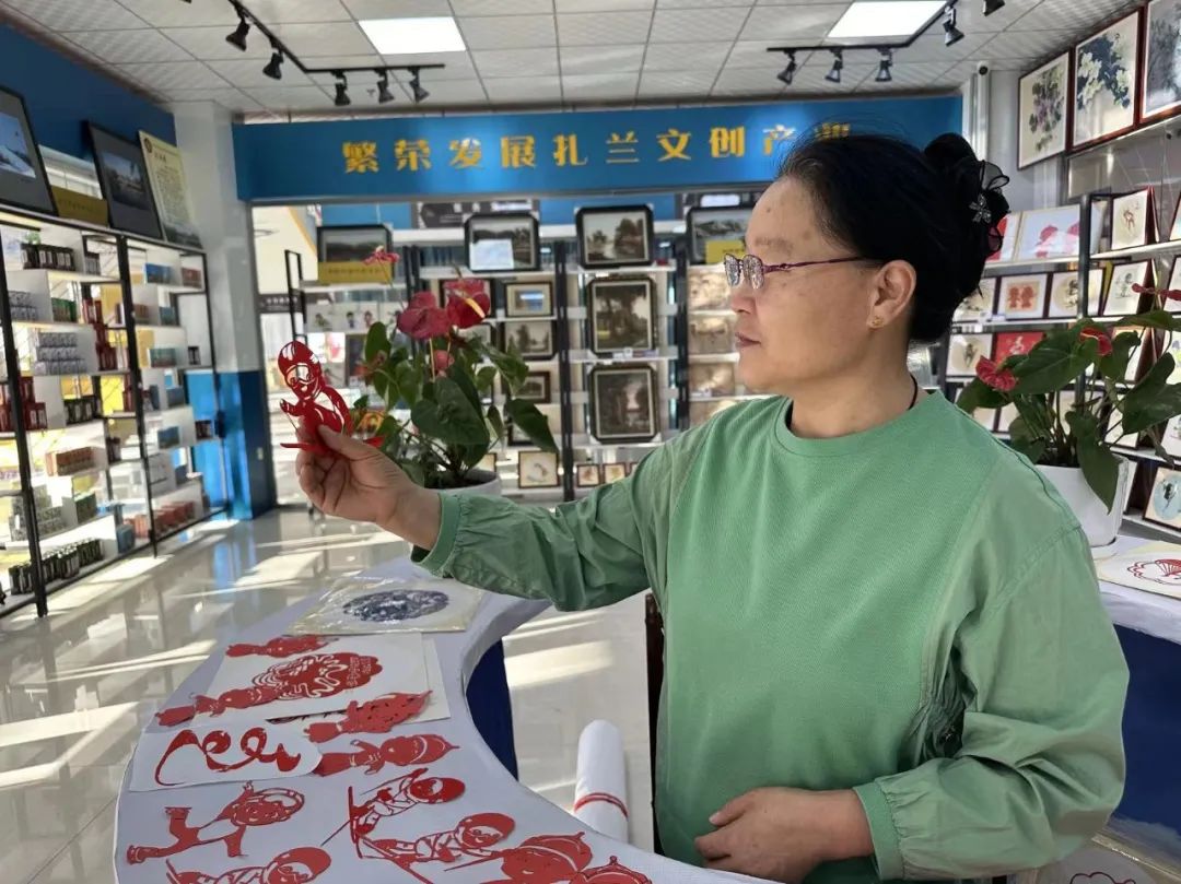 在“十四冬”扎兰屯赛区文创非遗现场展示区,内蒙古自治区级非遗剪纸项目传承人都叶梅创作的具有“十四冬”元素的剪纸作品十分抢眼。展柜里摆满了各类剪纸,“十四冬”形象、会标,滑冰、滑雪等比赛项目,造型栩栩如生、生动有趣,形象地讲述着体育的故事。
