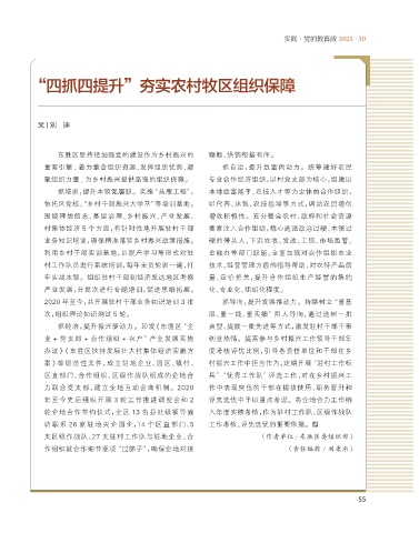 22 名,有效增强了干部队伍整体活力。严格落 聚力引才育才,竖起人才品牌“一面旗”。 村工作队员进行系统培训,每年全员轮训一遍,打 技术、经营管理方面的指导帮助,对农特产品质