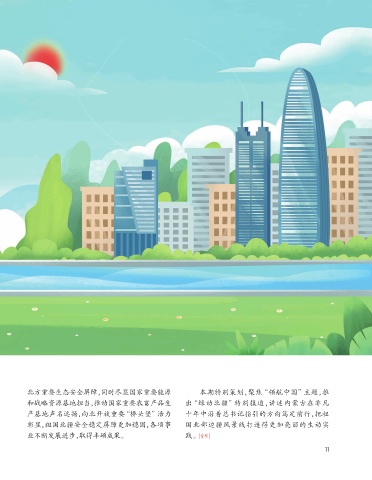 2022年第10期/总第1450期 实践/每月1日出版 北方重要生态安全屏障,同时尽显国家重要能源 本期特别策划,聚焦“领航中国”主题,推 和战略资源基地担当,推动国家重要农畜产品生 出“绿动北疆”特别报道,讲述内蒙古在非凡 产基地声名远扬,向北开放重要“桥头堡”活力 十年中沿着总书记指引的方向笃定前行,把祖 彰显,祖国北疆安全稳定屏障更加稳固,各项事 国北部边疆风景线打造得更加亮丽的生动实 业不断发展进步,取得丰硕成果。 践。 11