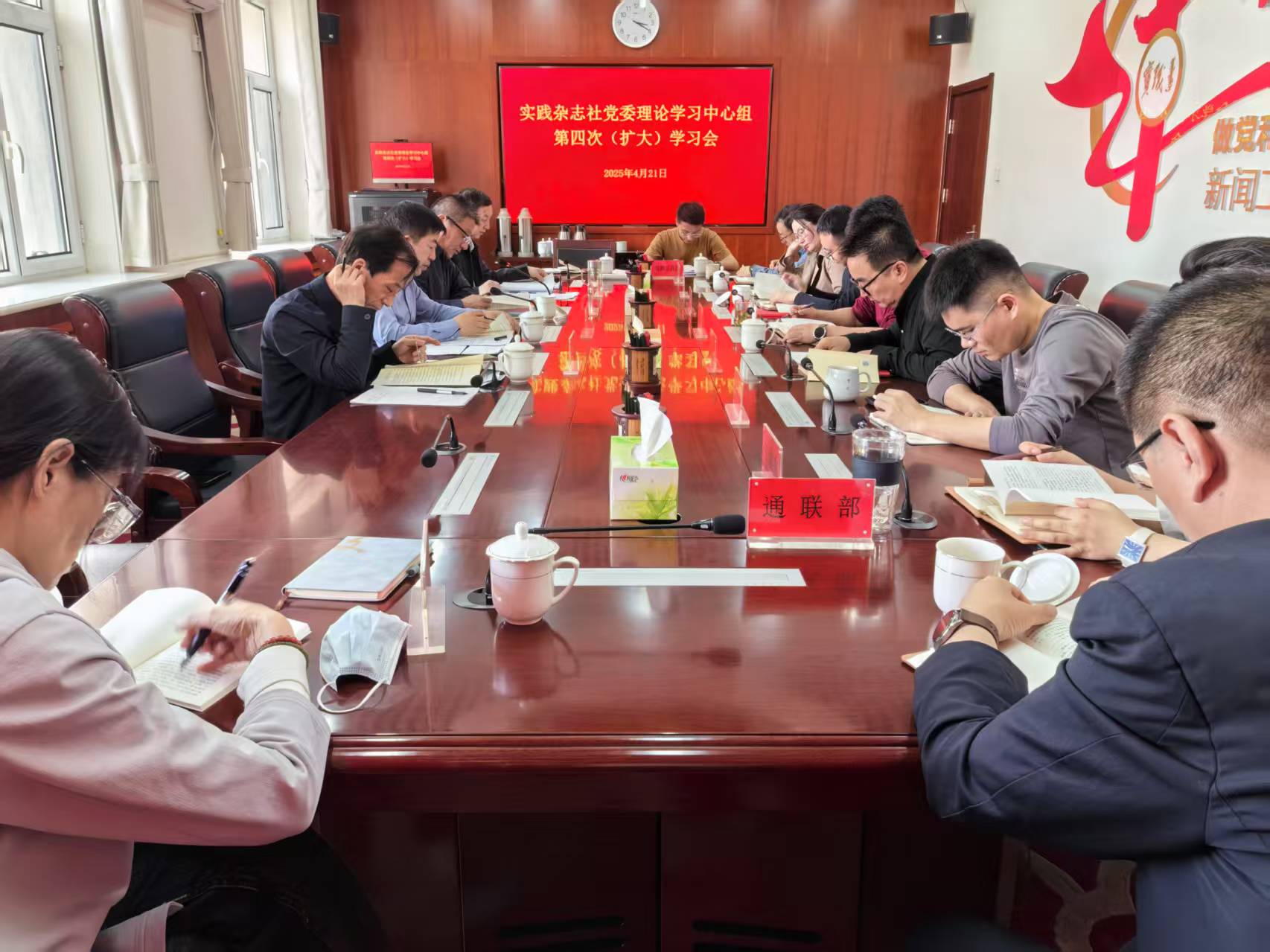 4月21日下午,实践杂志社召开党委理论学习中心组2025年第四次(扩大)学习会。社党委书记、社长李洪才主持会议,社领导班子成员、各部室负责人参加会议。
