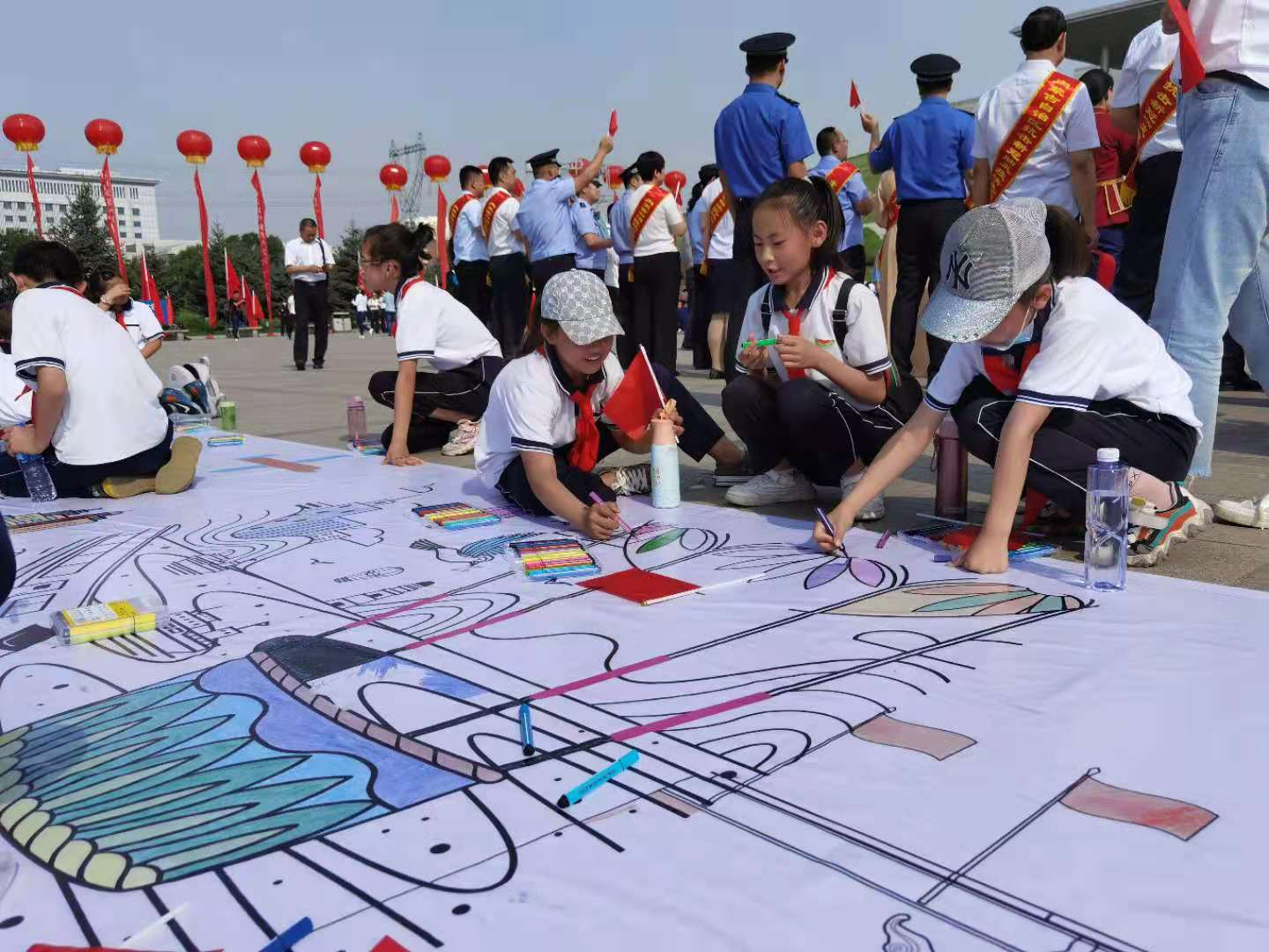 学生们认真涂鸦着百米长卷《致敬百年》。 尹伟光/摄