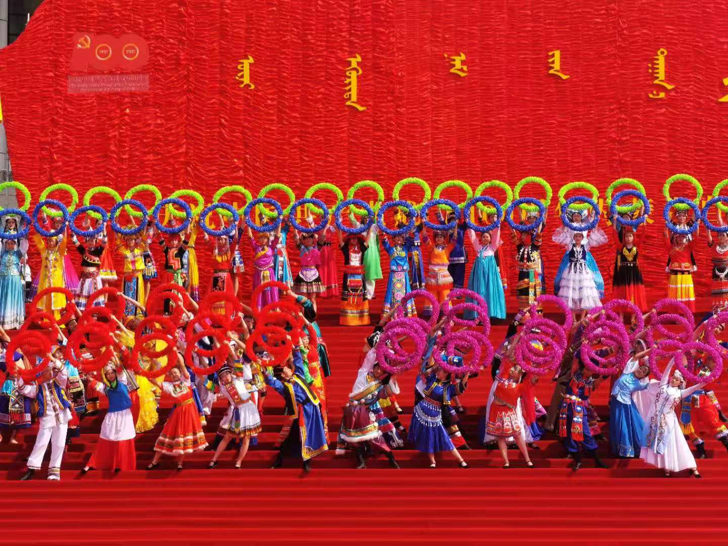 各族各界群众纷纷参与到启动式的文艺表演当中,演员即是观众,观众也是演员,现场气氛热烈。舞台上,小鸿雁艺术团的孩子们用歌舞《我们是共产主义的接班人》表达争做新时代好少年的决心,寓意着中国共产党的红色基因在百年征程中代代传承;交响组歌《唱支山歌给党听》《保卫黄河》气魄雄浑,铿锵的歌词带领大家重温百年峥嵘岁月,表达对党和祖国的无限热爱。舞台下,来自白庙子中心校的学生们认真涂鸦着百米长卷《致敬百年》,用手中的彩笔描绘祖国的辉煌成就和大好山河。充分展现了内蒙古各族干部群众紧密团结在以习近平同志为核心的党中央周围,坚定不移听党话、矢志不渝跟党走,守望相助、团结奋斗,夺取全面建设社会主义现代化国家新胜利的坚定信念。
