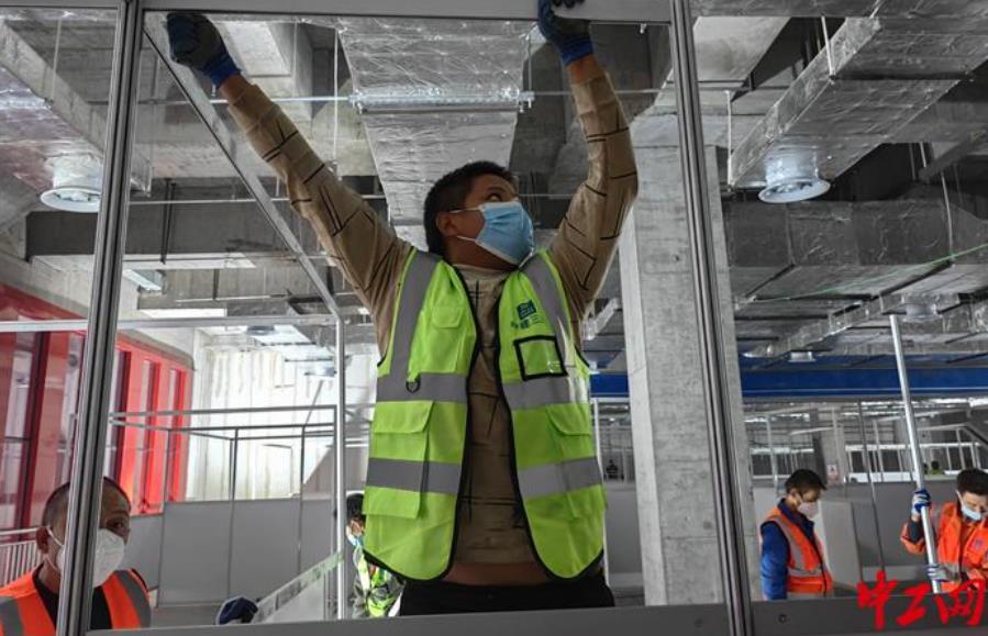10月7日深夜至10月10日凌晨,内蒙古呼和浩特革命历史博物馆隔离点顺利交付,图中工人在搭设防护隔断。中建三局内蒙古分公司供图
