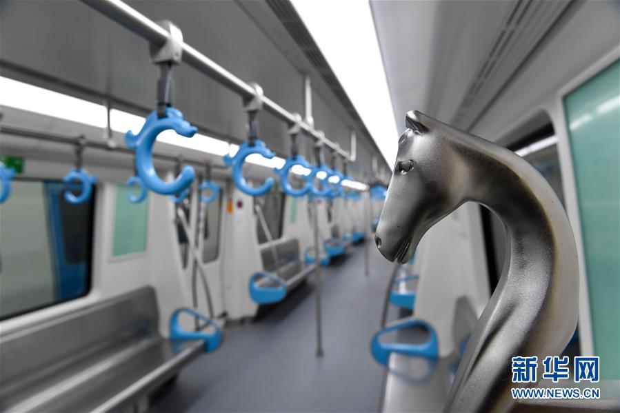 呼和浩特地铁2号线列车车厢内部的马头造型的扶手(5月20日摄)。