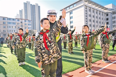 11月25日,民警辅导小学生学习交通指挥手势。在第十三个“全国交通安全日”即将到来之际,为增强小学生交通安全意识,呼和浩特市玉泉区交管大队景区中队民警走进五塔寺东街小学开展交通安全宣传教育活动。