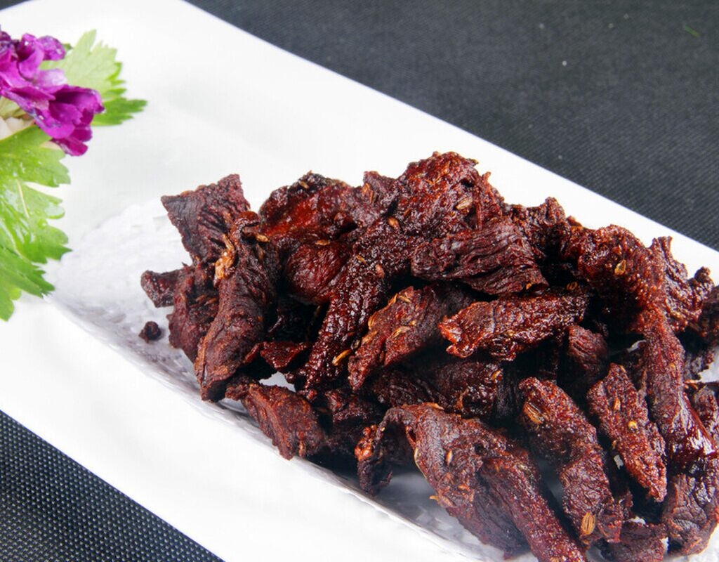 风干牛肉则是红食家族中极具特色的成员。传统风干肉制作极为简单,牛肉切条,悬挂在通风干燥处自然脱水,不加任何调料,成品坚硬、保存期长且营养高度浓缩。现代改良版的风干牛肉则更加注重口感,选用草原黄牛后腿肉,先以香料腌制,再经过风干、油炸等工序,最终形成纤维分明、撕咬感十足的休闲食品。值得一提的是,草原黄牛在天然放养环境下,“吃的是肥美鲜草,喝的是矿泉水”,为风干牛肉提供了绝佳原料。