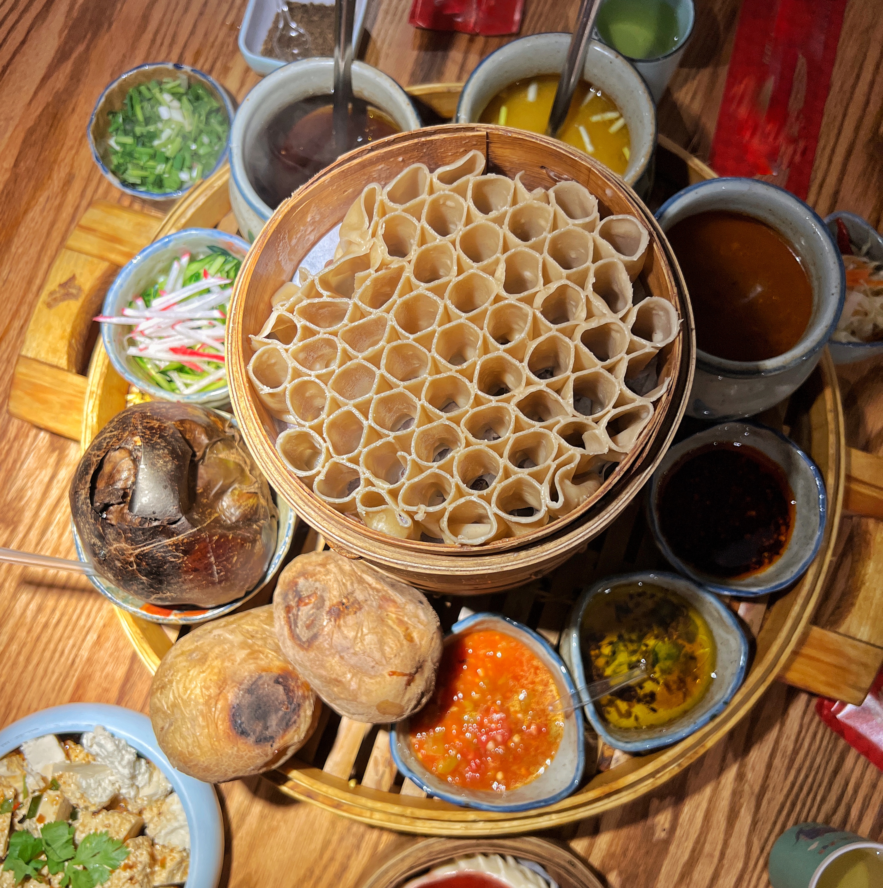 羊杂碎是红食体系中最具市井气息的存在,它将羊的下水(心、肝、肺、肠、肚等)物尽其用,在烟火缭绕中熬出一锅滚烫的生活哲学。羊杂的韧、汤的鲜,寒冬里一碗下肚,从头暖到脚。