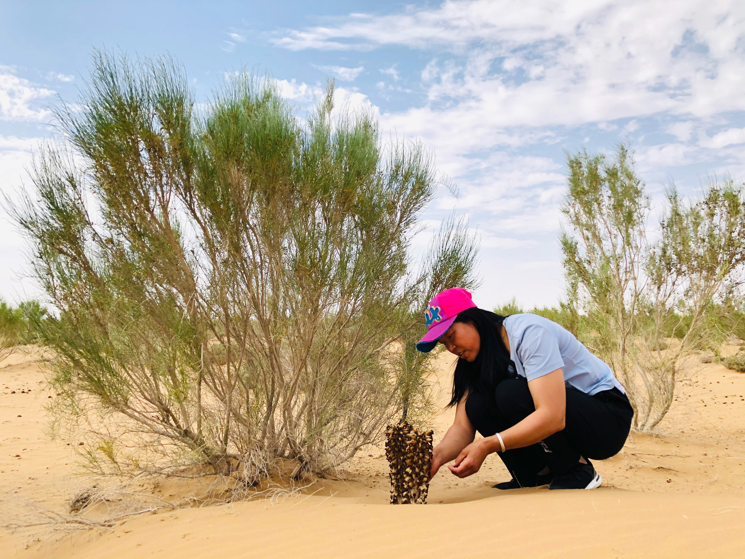 王春玲正忙着在自家2000亩梭梭林中查看嫁接的肉苁蓉是否接种成功。(摄影:彩丽格尔)