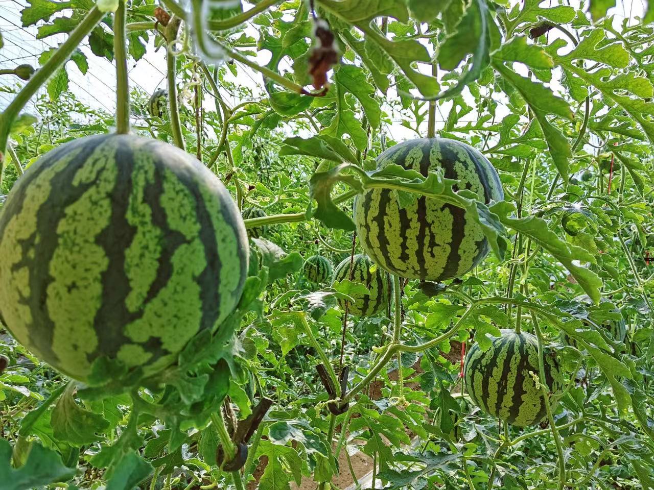 “这里种的是皮薄味甜的麒麟西瓜,公司直接上门采收,订单农业让我们的收入更有保障。”35岁的尹宝飞现有两个瓜棚,预计一年三茬西瓜可收入16万元左右。 “销路不用愁,种植也省心。”尹宝飞说,“公司提供优质种苗,无偿进行技术指导,我们就负责种植和管理。”在尹宝飞的另一栋西瓜棚内,工人张国美正在接待几位循朋友圈而来的市民。“除了由公司收购外,我们的‘订单瓜’还可以供游客采摘。”尹宝飞笑盈盈地说着,捶开了一个西瓜向记者展示,红瓤鲜润、盈汁流霞。