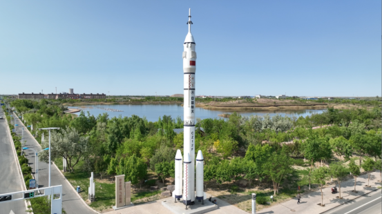 屹立在额济纳街边的长征二号F运载火箭模型。(图片来源:额济纳旗融媒体中心)