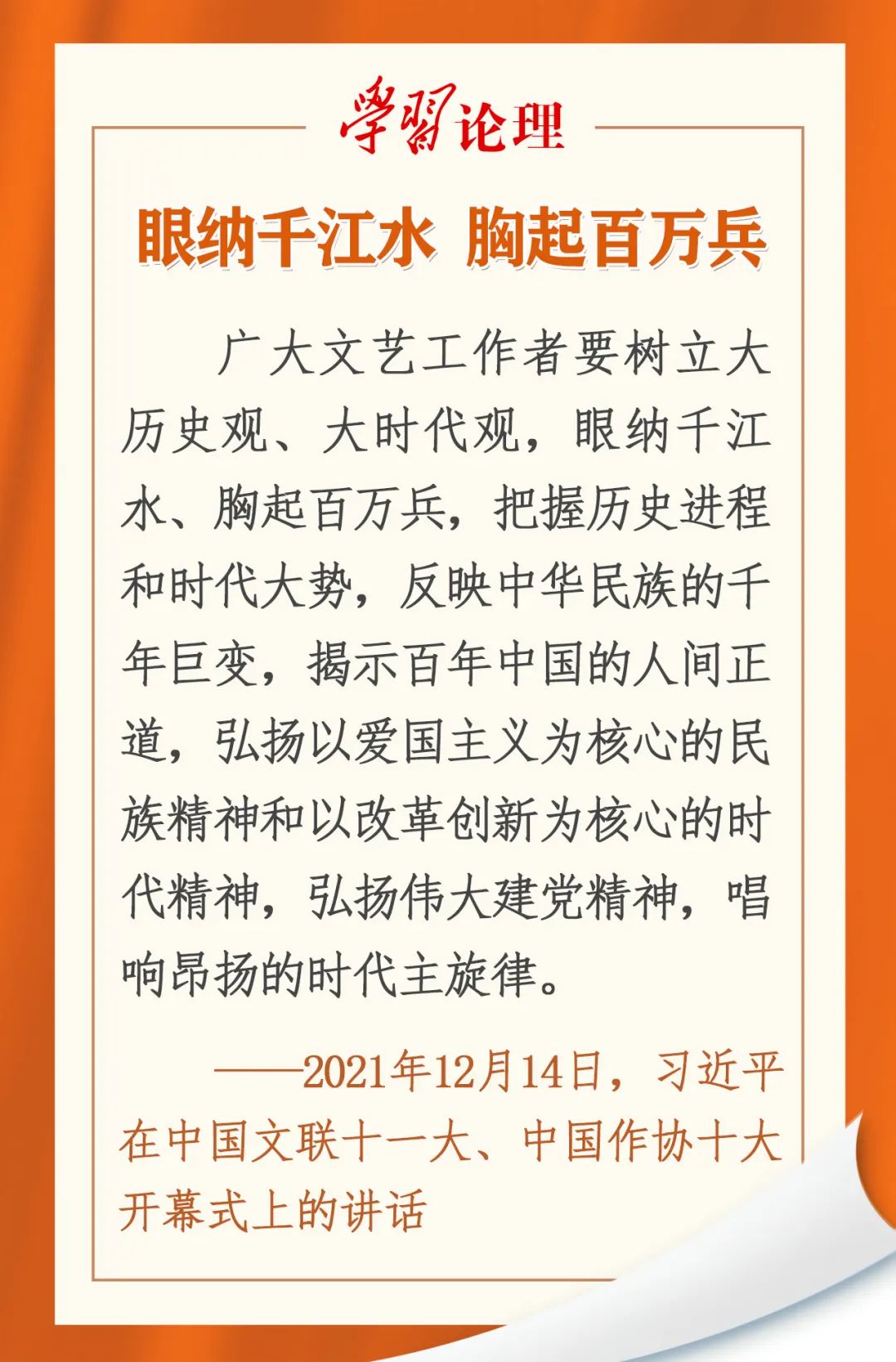 当代中国,江山壮丽,人民豪迈,时代为我国文艺繁荣发展提供了前所未有的广阔舞台。在中国文联十一大、中国作协十大开幕式上,习近平总书记对文艺工作者提出了殷切希望,要求我们树立大历史观、大时代观,眼纳千江水、胸起百万兵,心系民族复兴伟业,热忱描绘新时代新征程的恢宏气象。