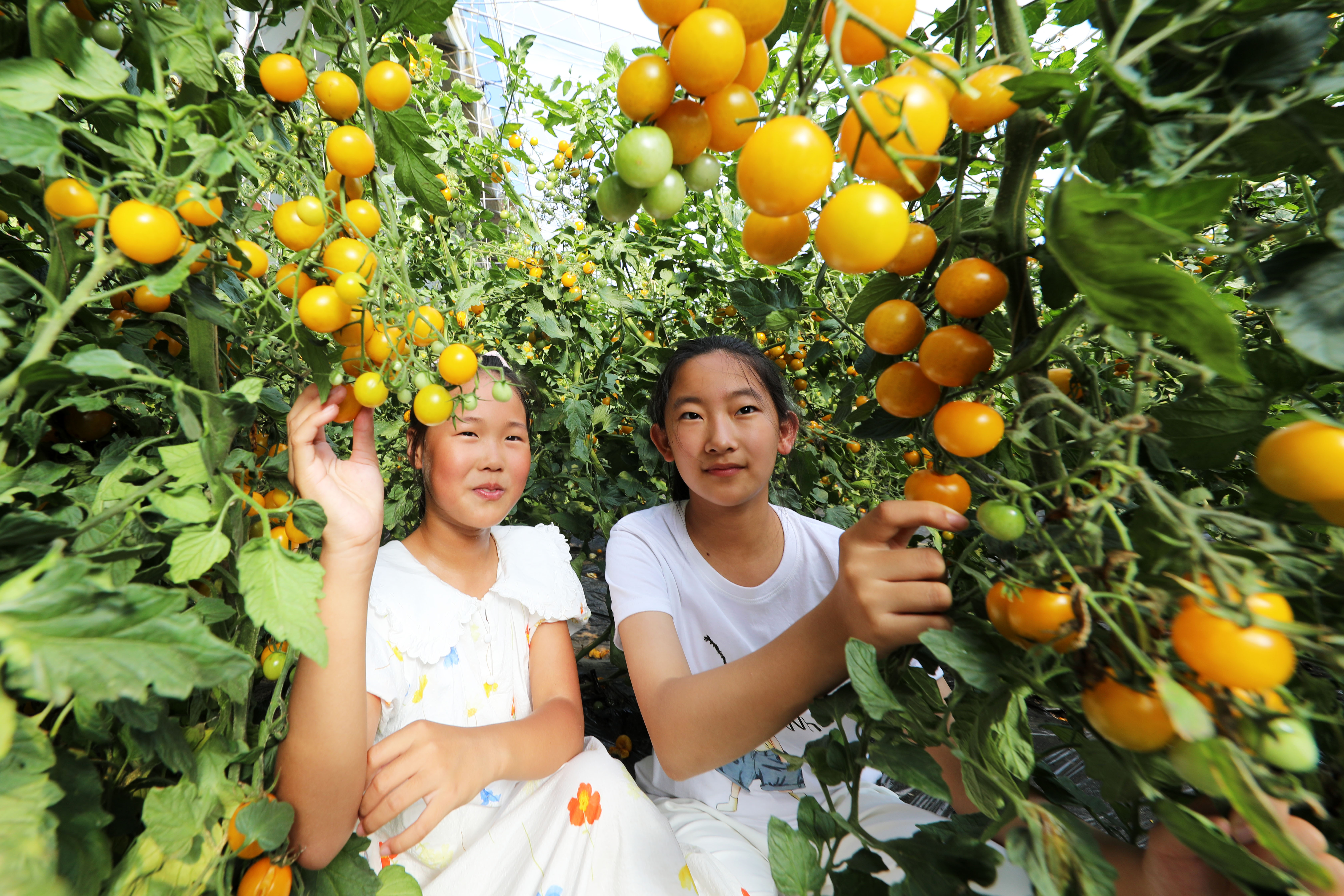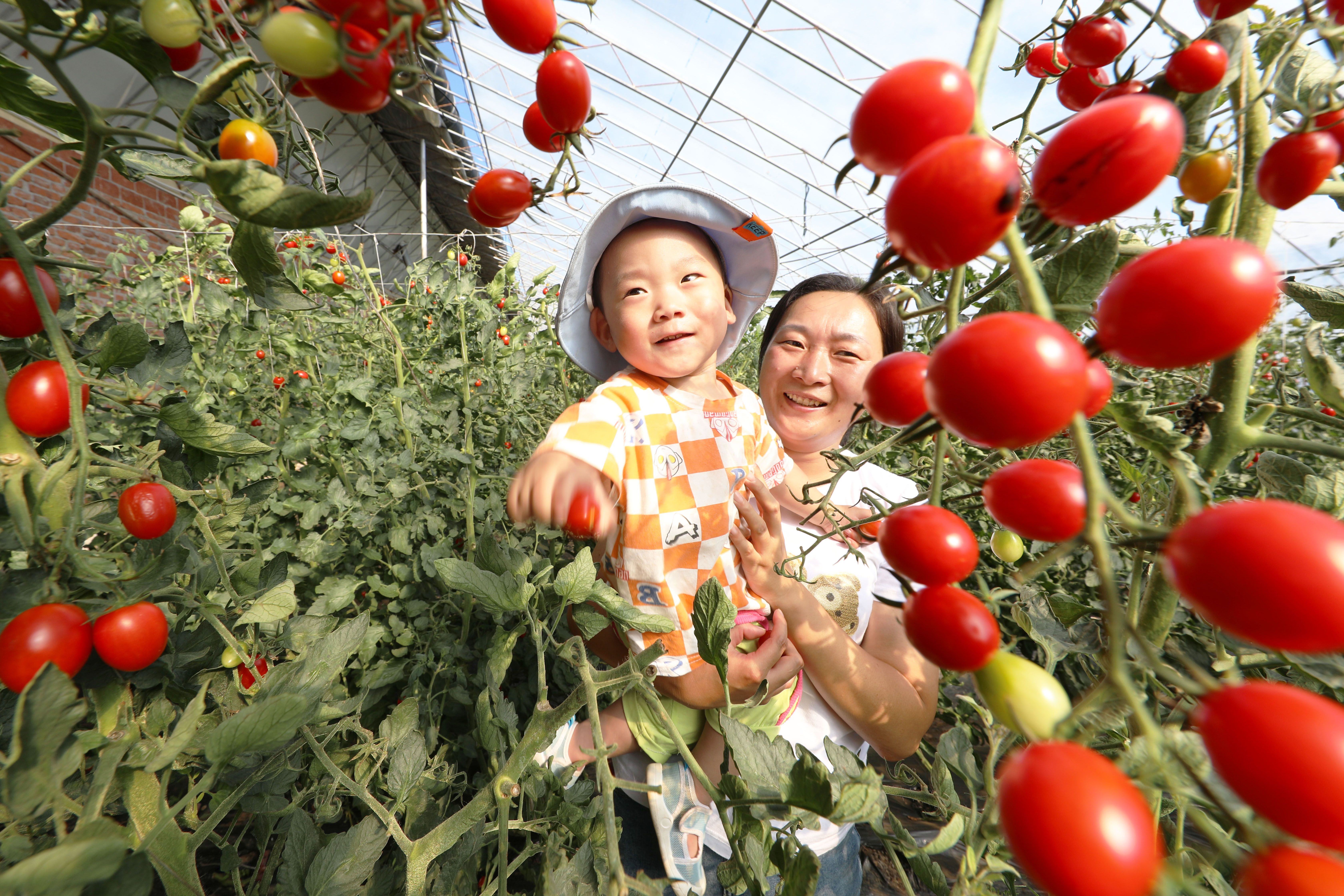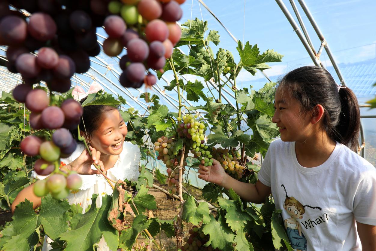 8月15日,小朋友在内蒙古自治区呼伦贝尔农垦扎兰屯农牧场有限公司第四连(队)采摘园采摘水果。新华网发(韩冷摄)