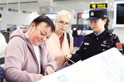 9月15日,满洲里出入境边防检查站民警指导俄籍旅客填写入境卡片。