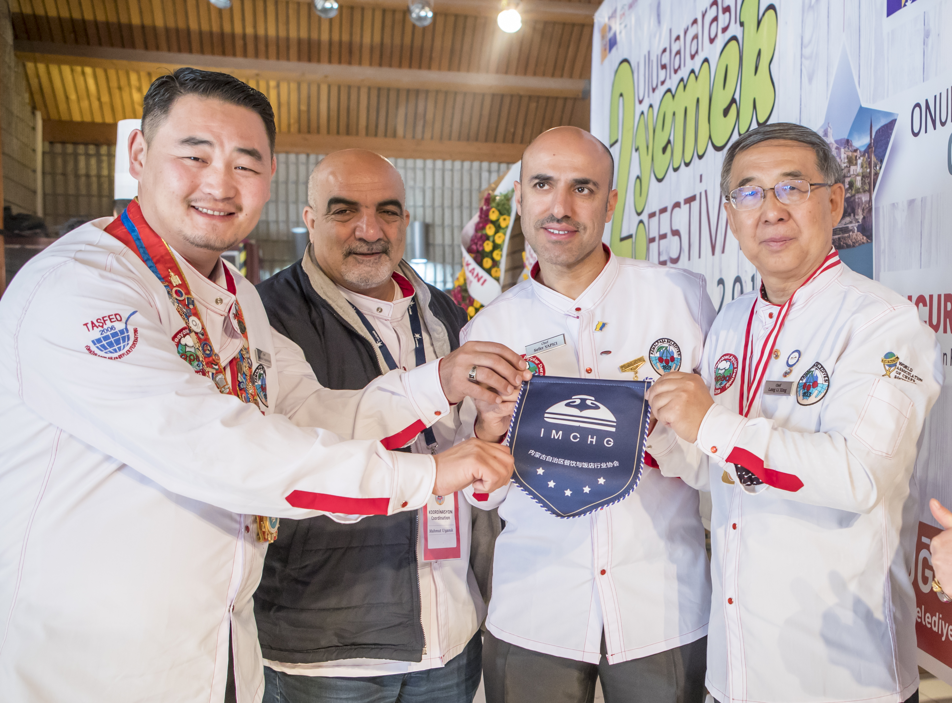 内蒙古自治区餐饮与饭店行业协会向土耳其厨师联盟赠送会旗。(摄影:青春)