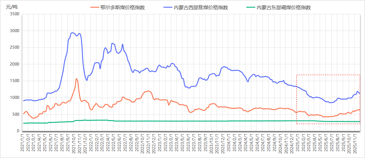 截至11月28日,鄂尔多斯煤价格指数报630元/吨,较1月初上涨56元/吨,涨幅9.76%;内蒙古西部焦煤价格指数报1118元/吨,较1月初下跌189元/吨,跌幅14.46%;内蒙古东部褐煤价格指数报283元/吨,较1月初下跌22元/吨,跌幅7.21%。