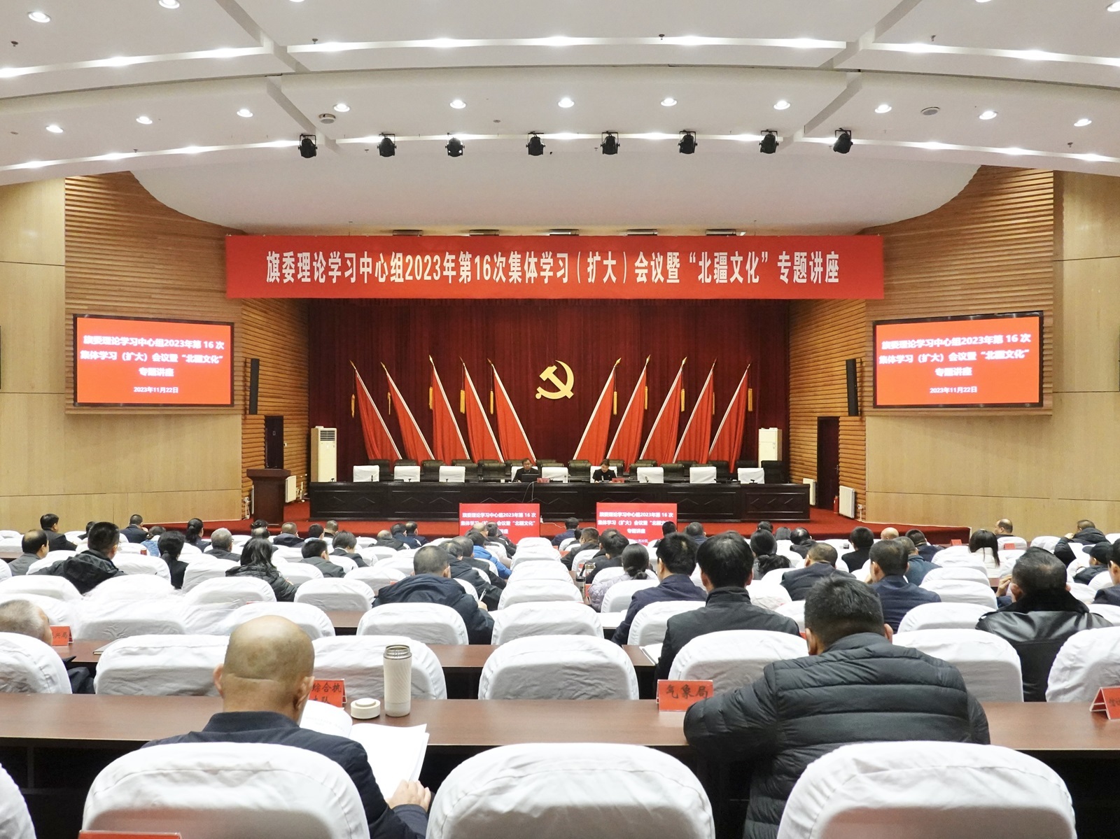 旗委理论学习中心组2023年第16次集体学习(扩大)会议暨“北疆文化”专题讲座。(摄影:马少媛)