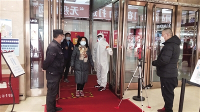 市民经过排队测温登记进入商场
