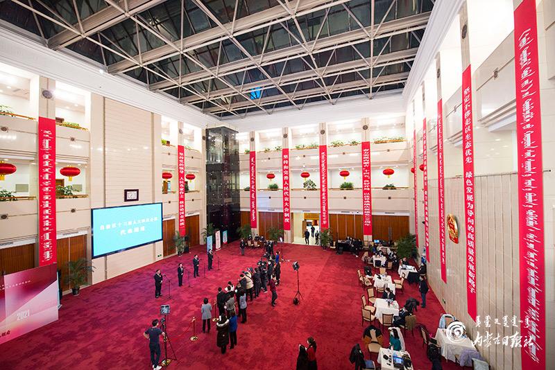 1月27日晚,自治区十三届人大四次会议“代表通道”集中采访活动在内蒙古人民会堂玻璃厅举行,8位人大代表分两组“亮相”。这是自治区人大首次开通“代表通道”。内蒙古日报社融媒体记者 金泉 摄