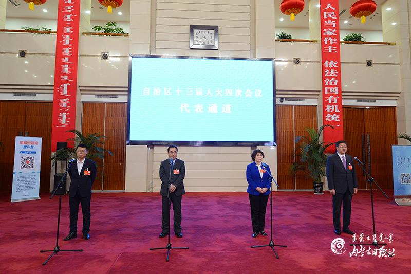 1月27日晚,自治区十三届人大四次会议“代表通道”集中采访活动在内蒙古人民会堂玻璃厅举行,8位人大代表分两组“亮相”。这是自治区人大首次开通“代表通道”。图为人大代表陈功明、刘淑华、唐毅和龚明珠4位代表(从左至右)回答记者提问。内蒙古日报社融媒体记者 金泉 摄