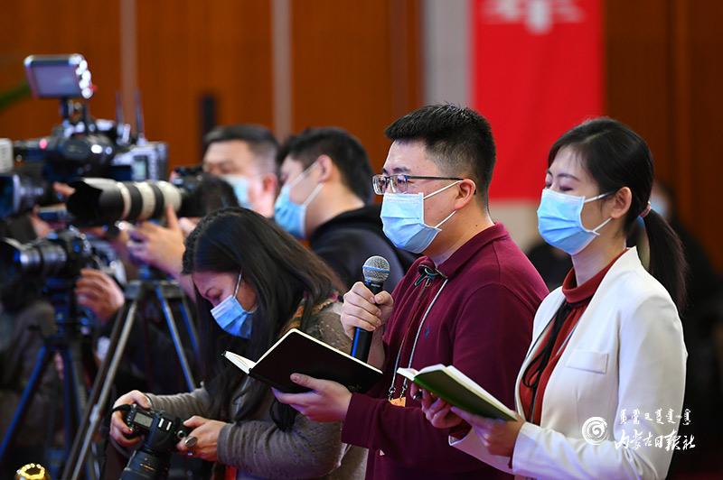 1月27日晚,自治区十三届人大四次会议“代表通道”集中采访活动在内蒙古人民会堂玻璃厅举行,8位人大代表分两组“亮相”。这是自治区人大首次开通“代表通道”。图为人民网记者在提问。内蒙古日报社融媒体记者 金泉 摄